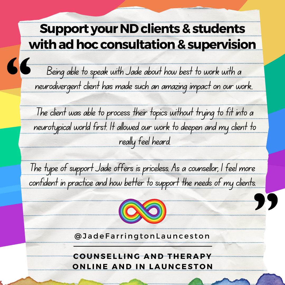 I offer ad hoc consultation to support with neurodiversity questions related to your client or education work, or general discussion around the neurodiversity paradigm. You must also have regular supervision in place if required by your role. I am unable to offer emergency consultation but will endeavour to meet with you as soon as possible when requested. Risk and safeguarding remain the responsibility of you and your existing supervisor or manager as applicable.