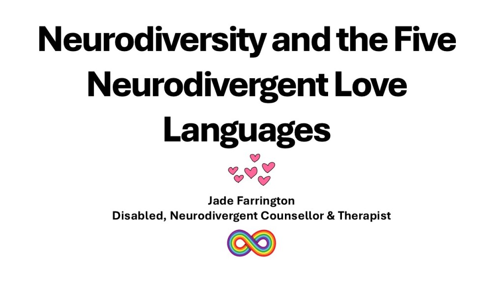 A 20-minute neuro-affirming presentation taking you on a journey through the neurodiversity paradigm and movement and sharing some of the beautiful ways in which neurodivergent people express their love.